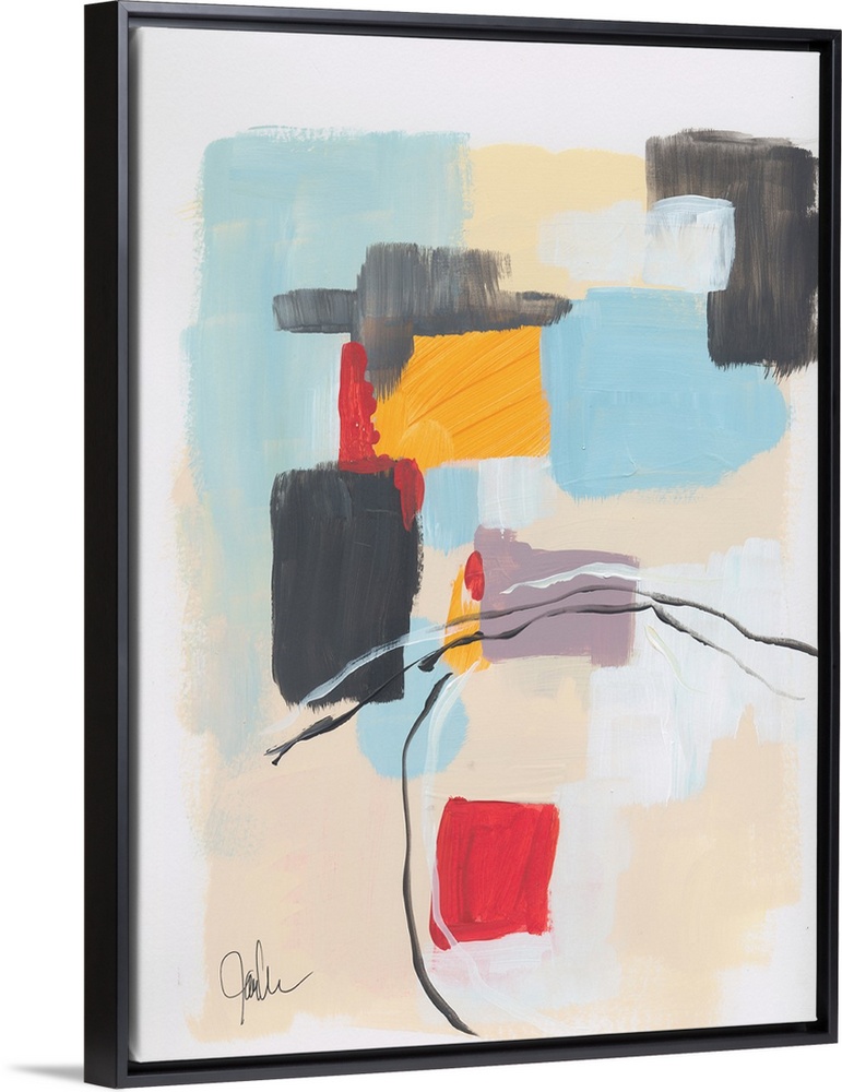 <p>Abstract artwork featuring blocks of color in various shapes with thin gestural brush strokes as an accent.</p>