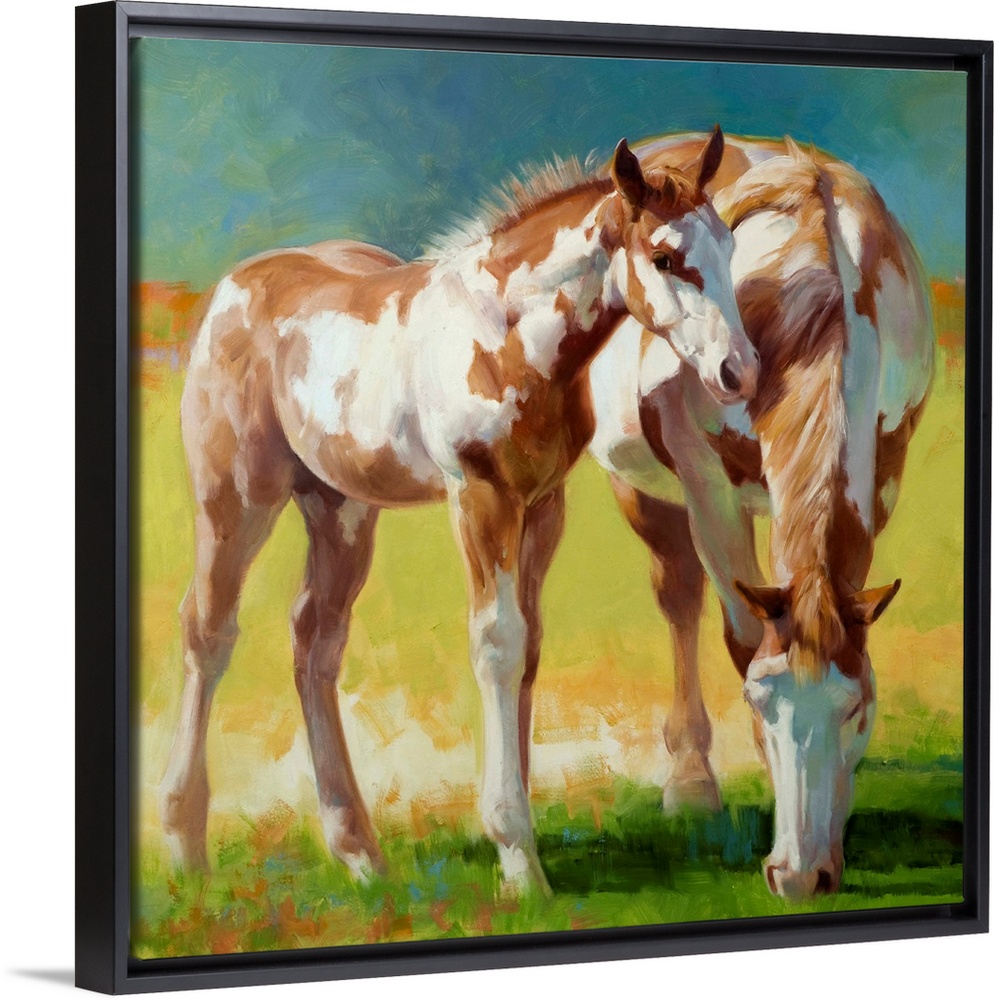 <p>A Paint mare and her foal grazing in a field in soft light.</p>