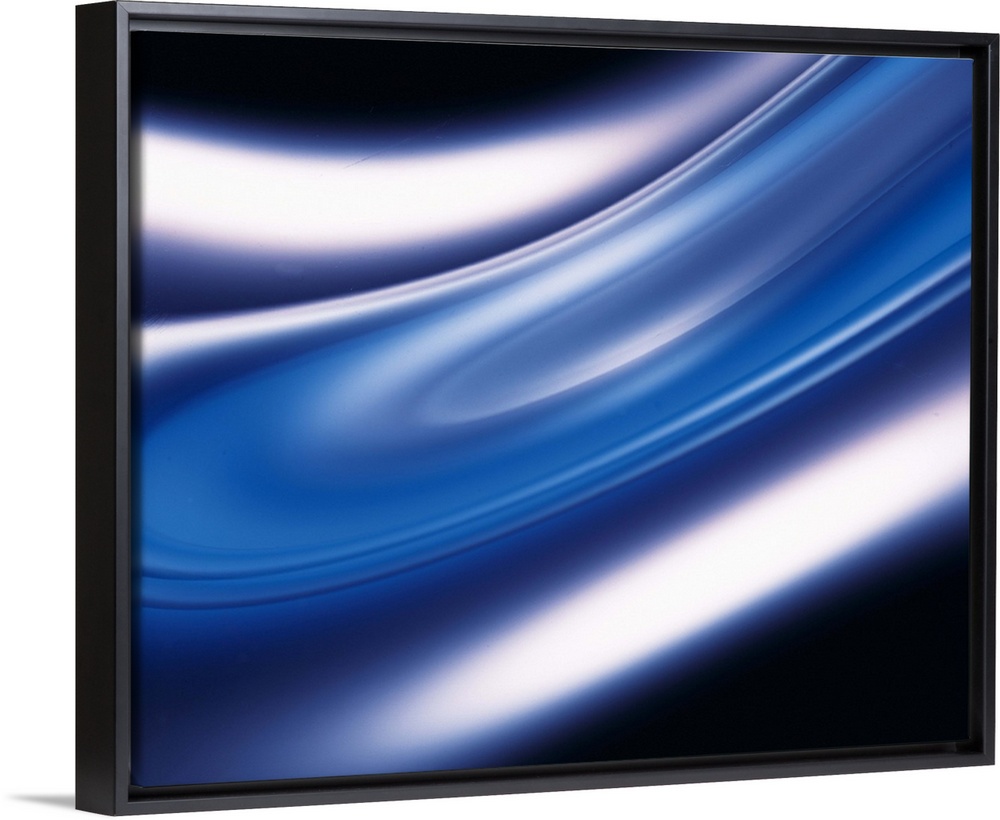 <p>A large swirl of cool colors is created with bright reflections on either side against a dark background.</p>
