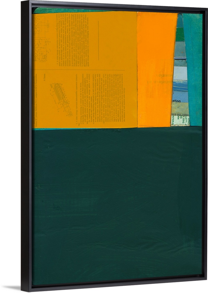<p>Abstract cityscape collage using vintage cut paper and oil paint. Colorful teal blue and bright orange geometric angles that resemble a building shadow.</p>