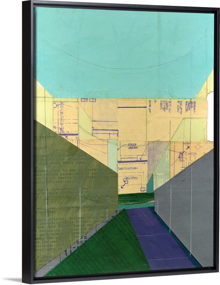 <p>Abstract cityscape collage using vintage cut paper and oil paint. Colorful blue, green, and yellow geometric angles resemble a Brooklyn city block with power lines.</p>
