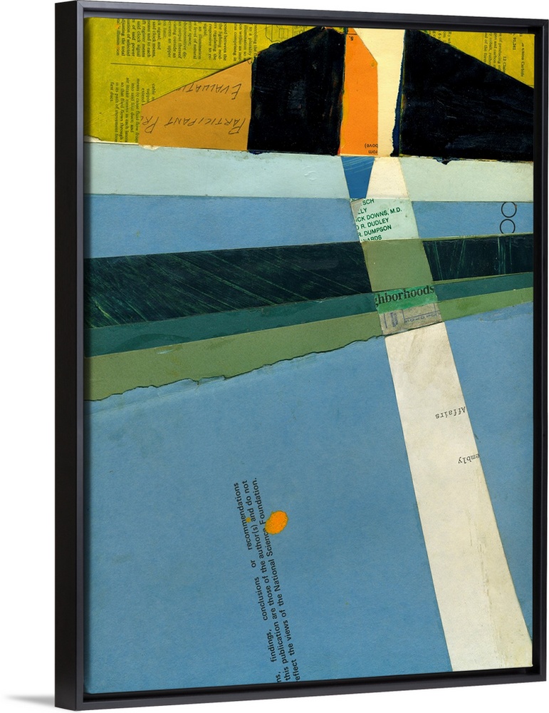 <p>Abstract cityscape collage using vintage cut paper and oil paint. Colorful blue, orange, and yellow geometric angles resemble a city building with light and shadow passing through it.</p>