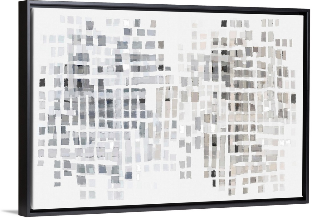<p>A contemporary abstract piece with a grid of grey and beige squares on a white background</p>