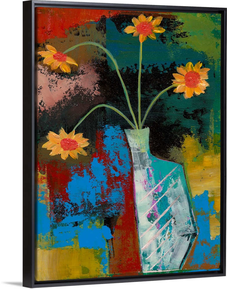 <p>A painting of a vase holding flowers against an abstract background.</p>