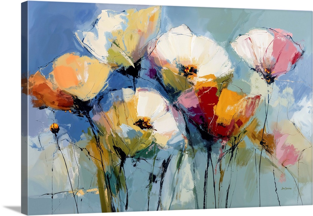 <p>A vibrant abstract floral artwork featuring tall poppy flowers rising against a soft blue background. Bold shapes of white, yellow, orange, red, and pink blend together with loose, expressive movement, creating a lively and uplifting scene full of color and flow. This artwork brings a fresh, cheerful touch to any home, perfect for those who love flowers, light, and modern color.</p>