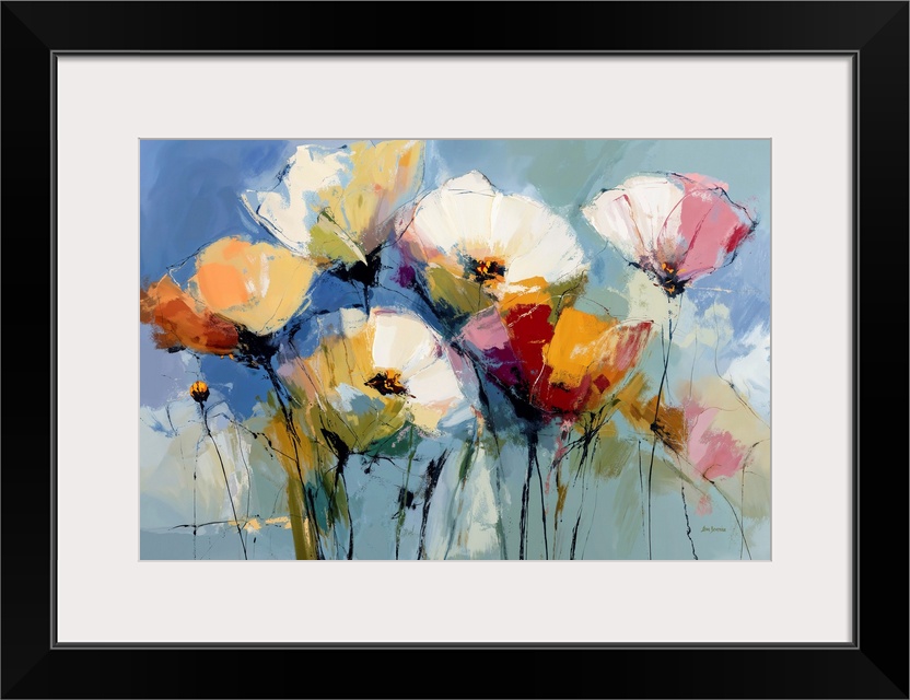<p>A vibrant abstract floral artwork featuring tall poppy flowers rising against a soft blue background. Bold shapes of white, yellow, orange, red, and pink blend together with loose, expressive movement, creating a lively and uplifting scene full of color and flow. This artwork brings a fresh, cheerful touch to any home, perfect for those who love flowers, light, and modern color.</p>