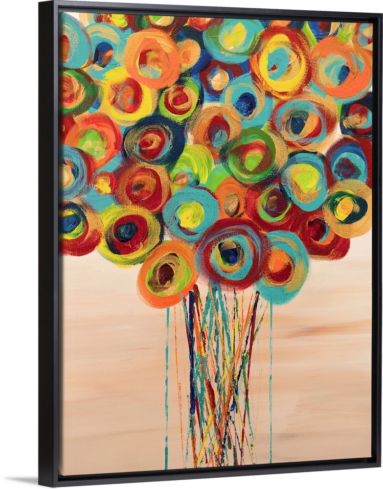 <p>A contemporary abstract painting of a bouquet of colorful flowers in a vase against a light brown background.</p>