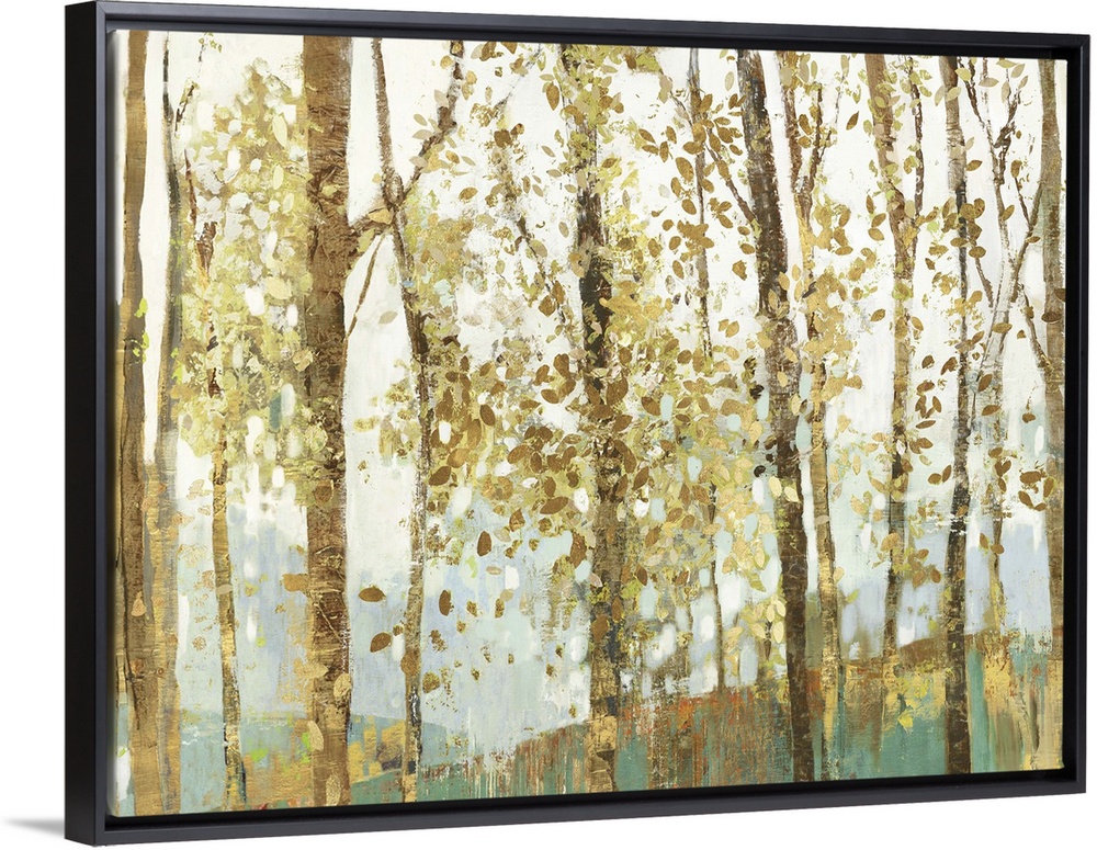 <p>Contemporary painting of a forest of thin trees speckled with golden leaves.</p>