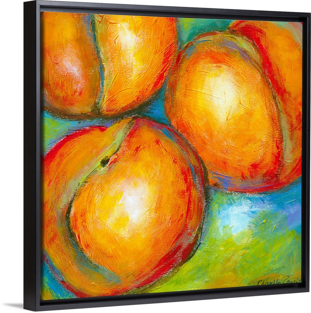 <p>A close up painting of three peaches painted with loose, impressionistic strokes in this contemporary square painting.</p>