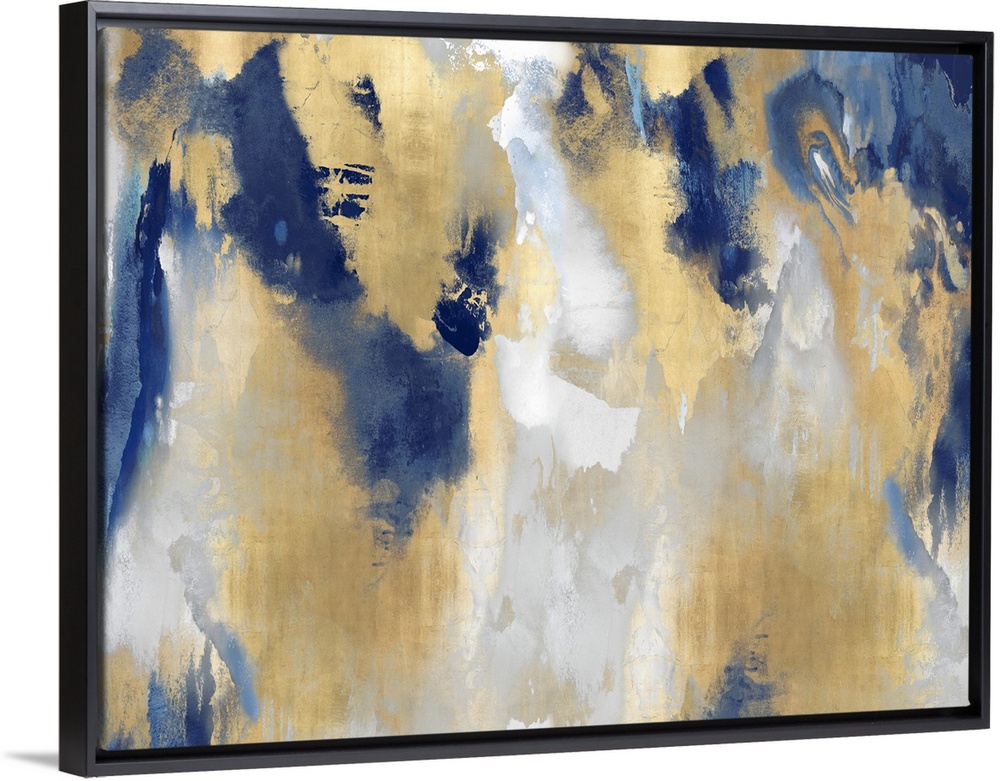 <p>A large, horizontal abstract painting in shades of indigo and gold. This statement piece of art would look outstanding in a dining room or over the fireplace.</p>