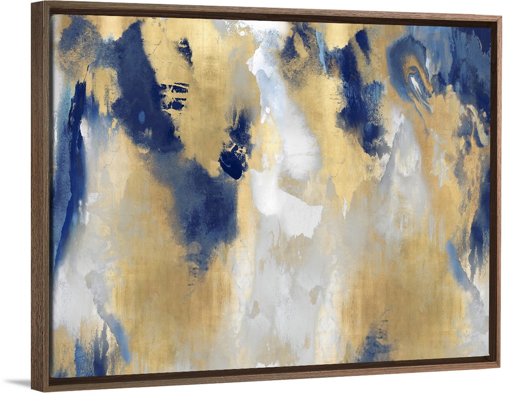 <p>A large, horizontal abstract painting in shades of indigo and gold. This statement piece of art would look outstanding in a dining room or over the fireplace.</p>