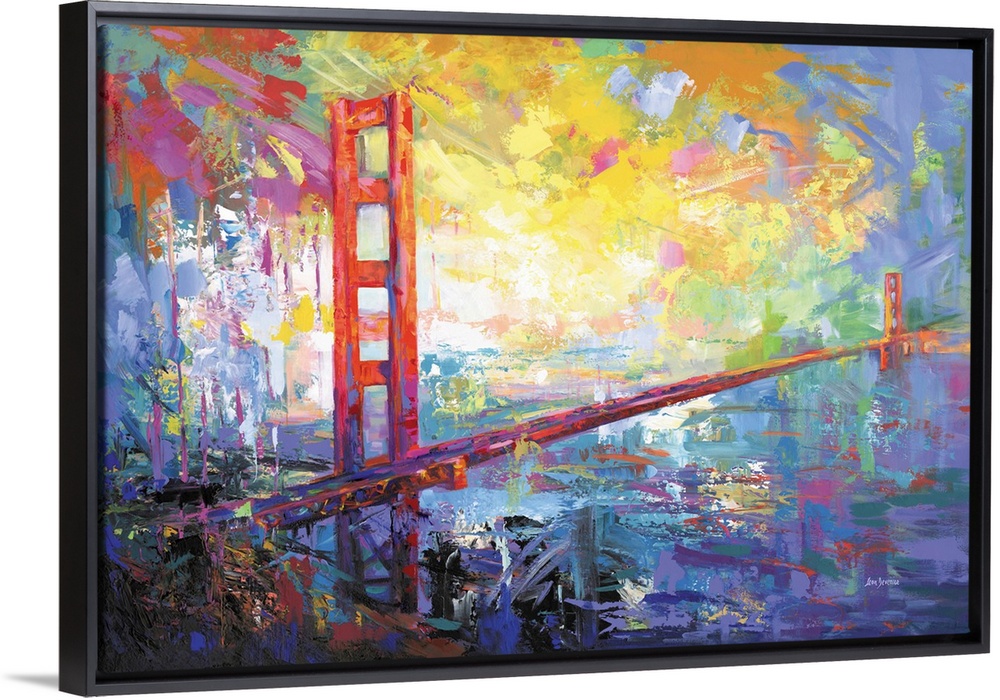 <p>Abstract interpretation of the Golden Gate Bridge stretches across a glowing sky, bathed in bold strokes of yellow, violet, and crimson. The bridge rises from layered textures and expressive color, connecting land and sea in a dreamlike panorama. This modern landscape captures the energy and spirit of San Francisco with striking, contemporary flair.</p>