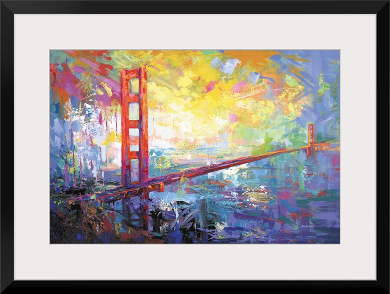 <p>Abstract interpretation of the Golden Gate Bridge stretches across a glowing sky, bathed in bold strokes of yellow, violet, and crimson. The bridge rises from layered textures and expressive color, connecting land and sea in a dreamlike panorama. This modern landscape captures the energy and spirit of San Francisco with striking, contemporary flair.</p>