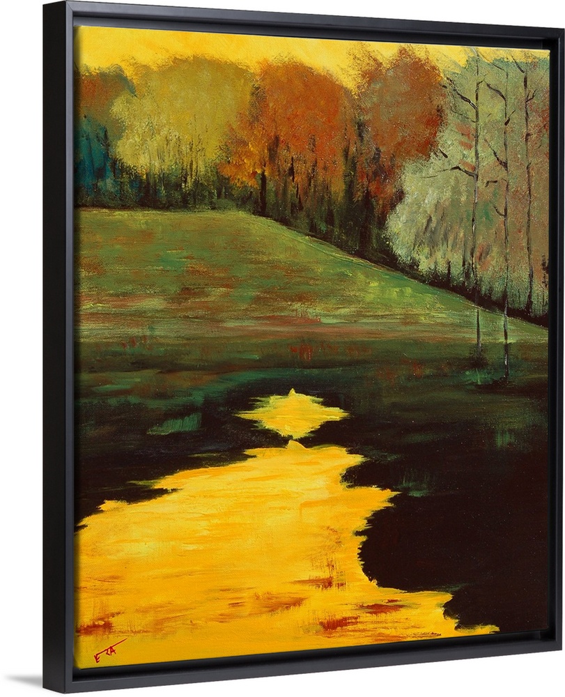 <p>A contemporary landscape of a field and trees next to a lake in warm autumn colors.</p>