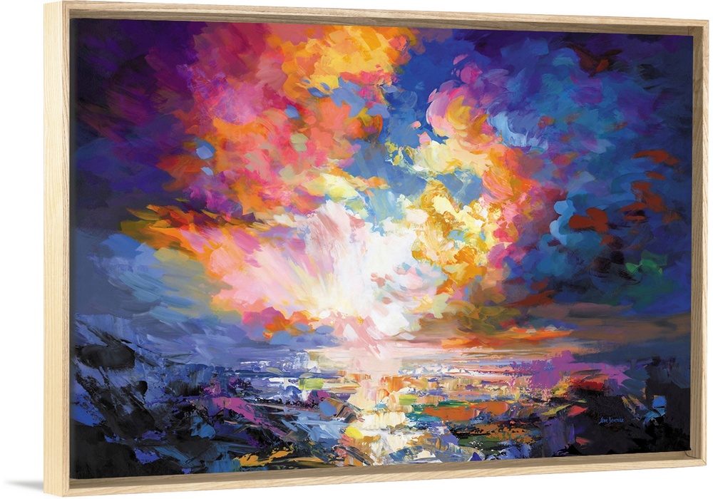 <p>A burst of vibrant clouds stretches across the sky in this abstract modern ocean sunset by Leon Devenice, where light cascades over reflective water in waves of color. The horizon glows with warmth and motion, blending deep blues, fiery oranges, and soft pinks. This dramatic contemporary seascape captures the emotional energy of sky meeting sea.</p>