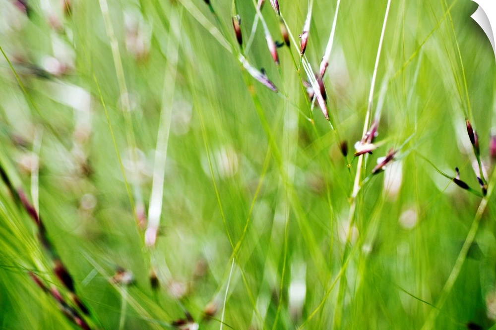<p>Horizontal abstract photograph on a giant canvas of a close up, blurred view of green ornamental grass in the sunlight.</p>