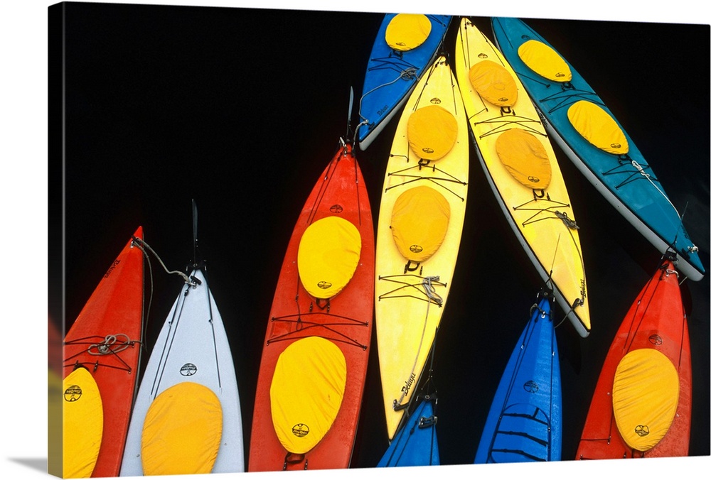<p>Abstract Overview Of Colorful Kayaks Tied Up Together On Water Inside Passage Southeast Alaska</p>