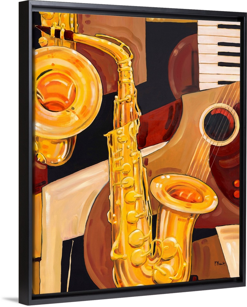 <p>Abstracted painting of a saxophone and other musical instrument elements, done in neutral tones.</p>