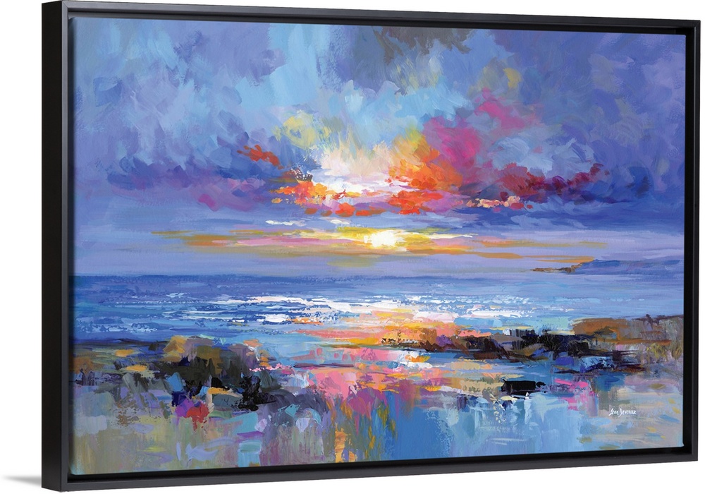 <p>A colorful abstract seascape with a glowing sunset spreading across the horizon, casting warm light over the drifting waves and reflective shoreline. Soft blues, violets, and radiant pinks move through the sky and water, creating a serene yet vibrant coastal atmosphere. This artwork brings a soothing, luminous touch to any home, ideal for anyone who loves color, calm, and the beauty of the sea.</p>