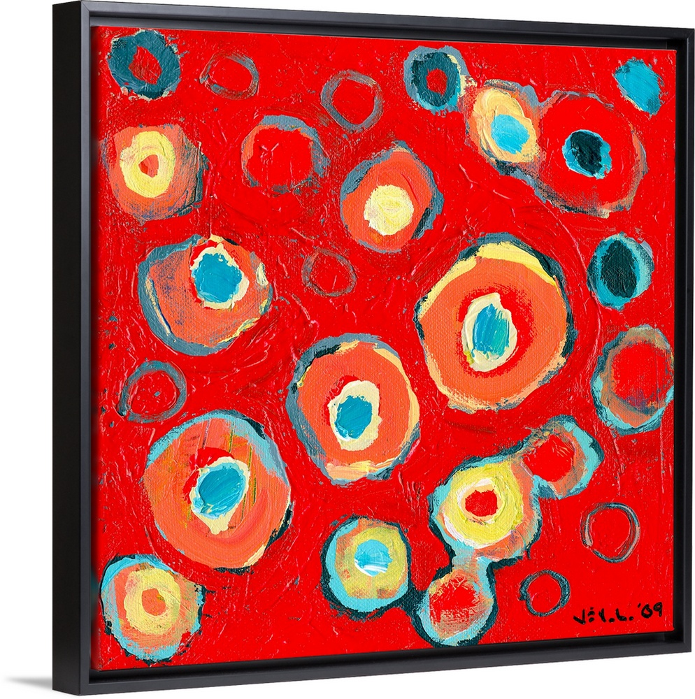 <p>Large abstract painting featuring various vibrantly-colored circular designs inside one another on a bright background.</p>