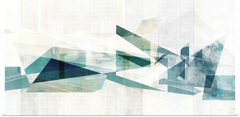 <p>Horizontal painting of geometric shapes with lines in a grid pattern.</p>