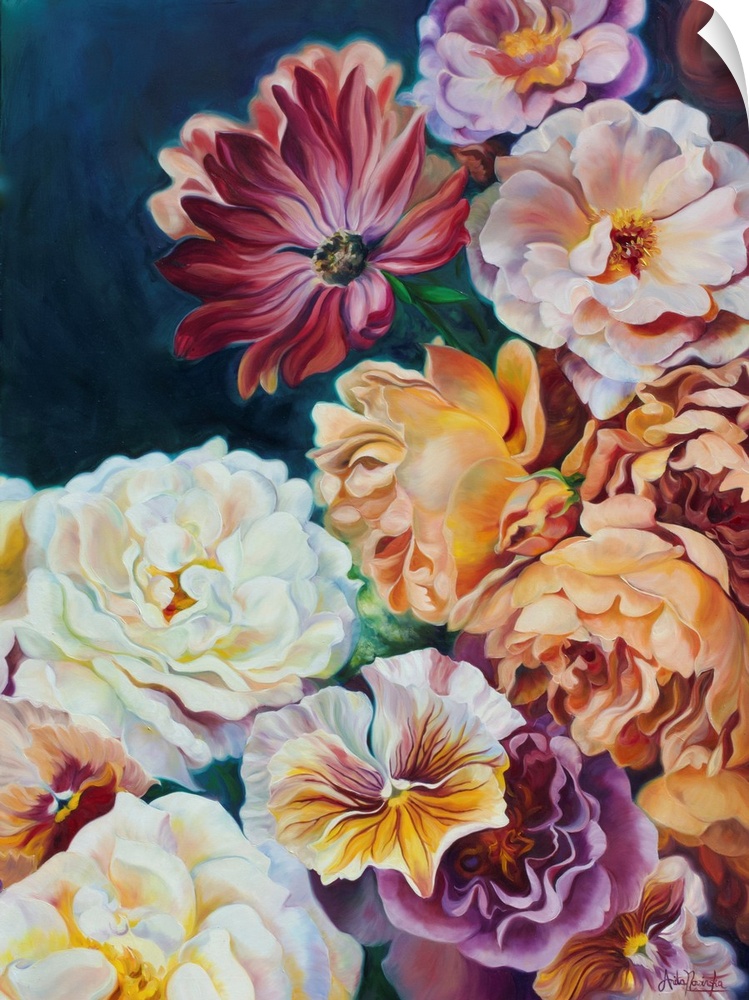 <p>Abundance is a big flower painting of a wedding bouquet filled with golden roses, cream roses, burgundy cosmos and pansies on a dark teal background.</p>