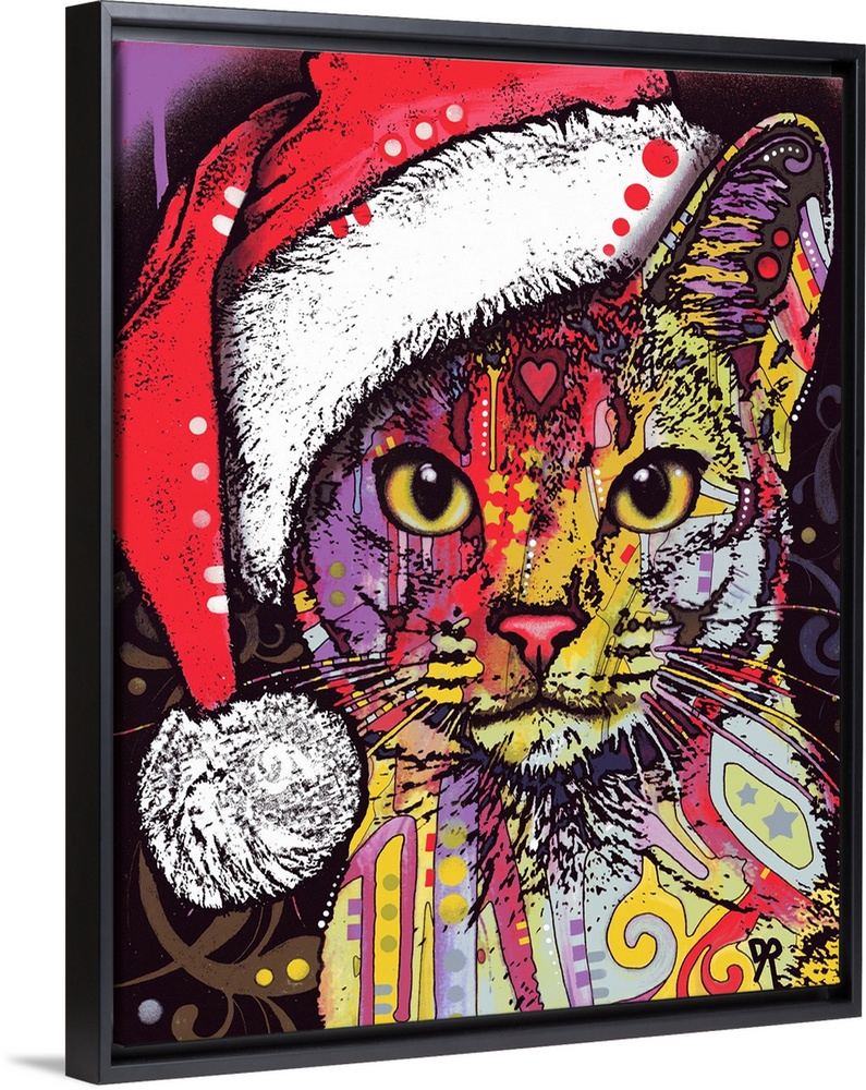 <p>Cute painting of a colorful cat with abstract designs wearing a Christmas hat.</p>
