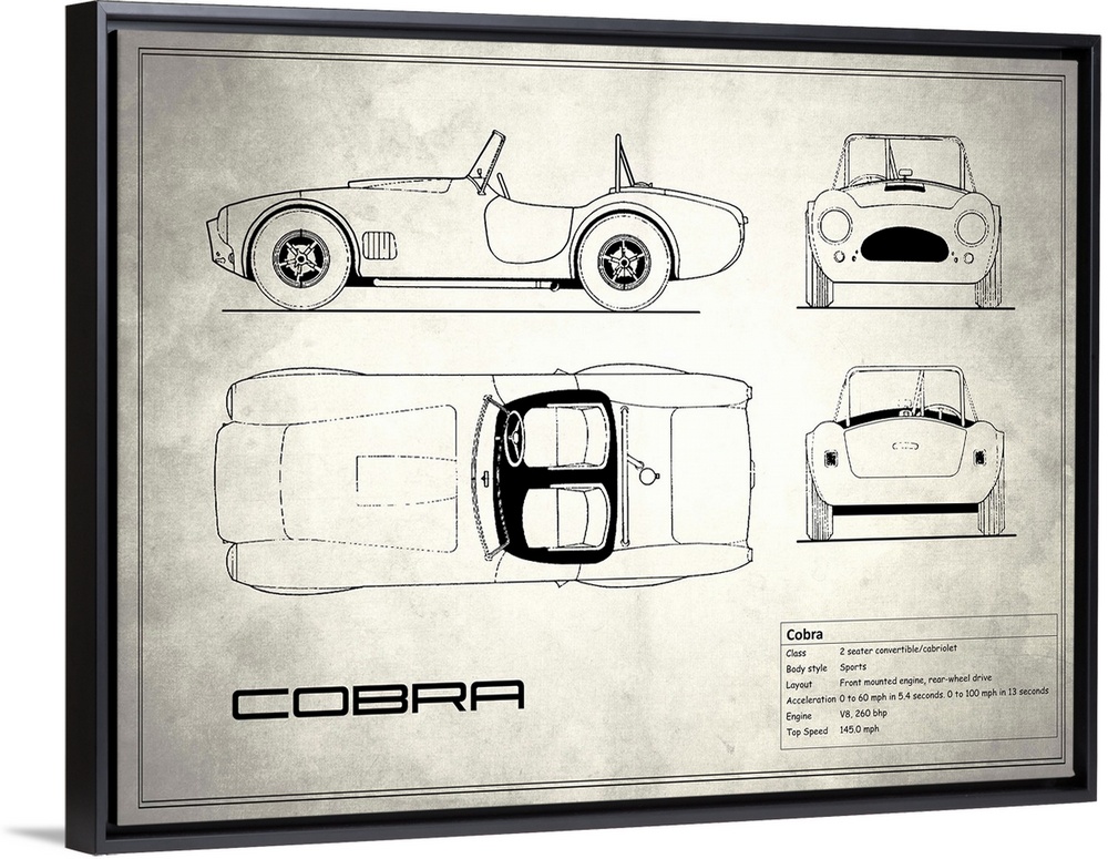 <p>Antique style blueprint diagram of an AC Cobra printed on a weathered white and gray background.</p>