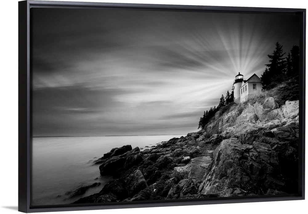 <p>A black and white photograph of a lighthouse on the coast of Maine.</p>