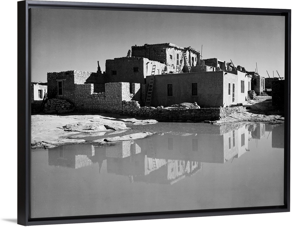 <p>Acoma Pueblo, New Mexico, full side view of adobe house with water in foreground.</p>