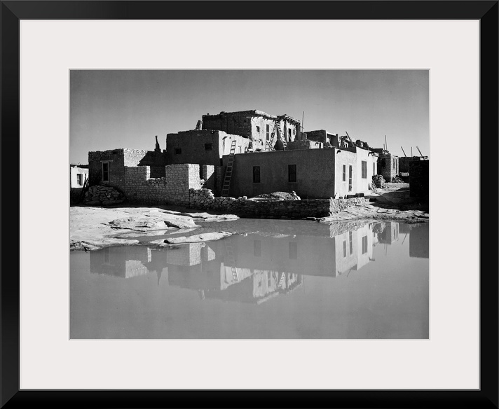 <p>Acoma Pueblo, New Mexico, full side view of adobe house with water in foreground.</p>
