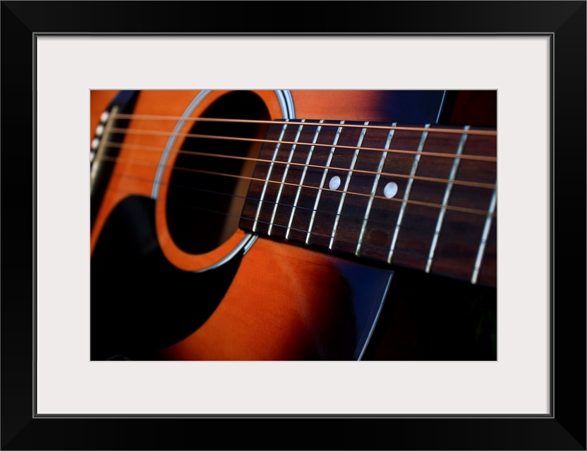 <p>Close up of a six string acoustic guitar.</p>