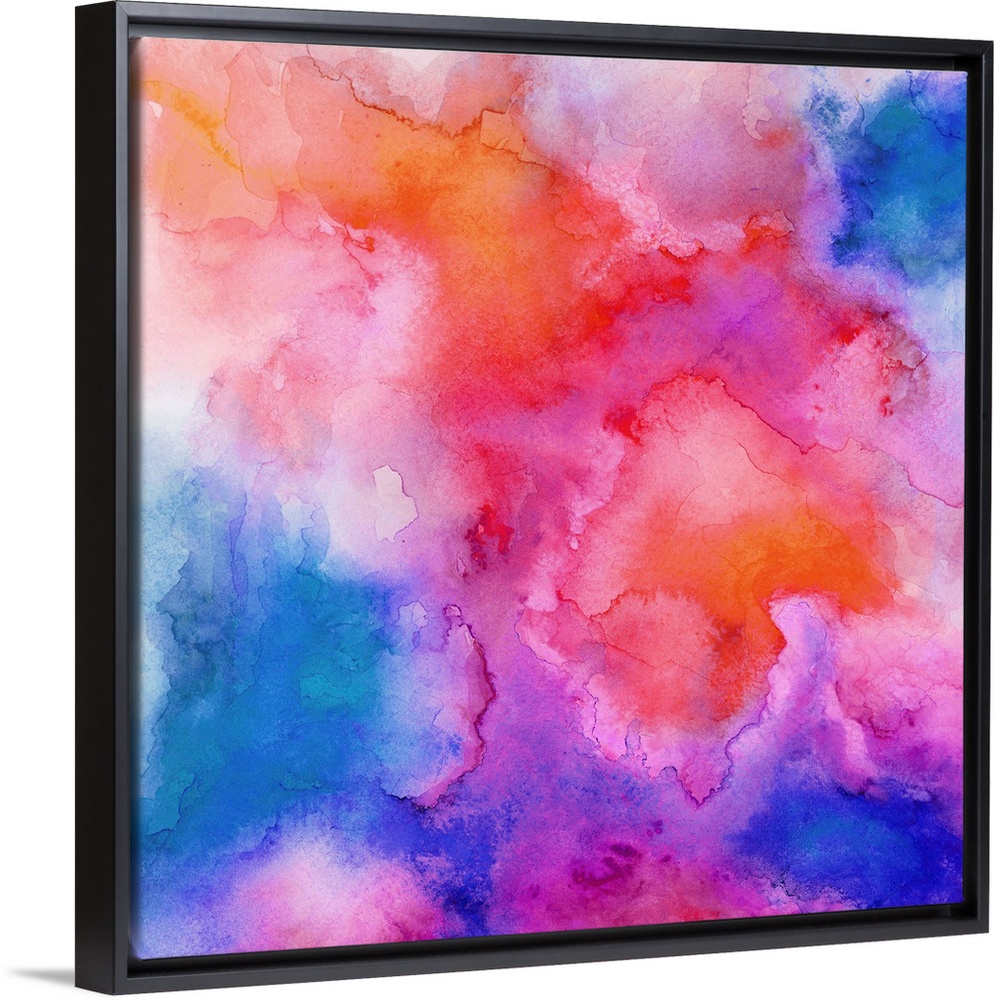 <p>A square abstract watercolor painting in brilliant colors of pink, orange and blue.</p>