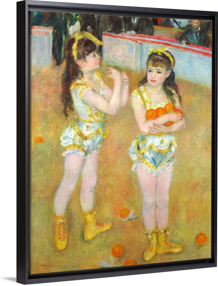 <p>The two little circus girls in this painting are Francisca and Angelina Wartenberg, who performed as acrobats in the famed Cirque Fernando in Paris. Although they were depicted in the center of a circus ring, the sisters actually posed in costume in Pierre-Auguste Renoir's studio, enabling him to paint them in daylight. Here he portrayed them just as they have finished their act and are taking their bows. One sister turns to the crowd, acknowledging its approval, while the other faces the viewer with an armful of oranges, a rare treat that the audience has tossed in tribute. Although Acrobats at the Cirque Fernando, reflects the artist's enchantment with the innocence of childhood - he has enveloped the girls in a virtual halo of pinks, oranges, yellows, and whites - the partially visible, darkly clothed (mainly male) spectators allude to the less wholesome, nocturnal demimonde of the nineteenth-century circus in which these two young performers grew up. The famed Chicago collector Mrs. Potter Palmer purchased Acrobats at the Cirque Fernando in 1892 and was so enamored of the picture that she kept it with her at all times, even on her travels abroad.</p>