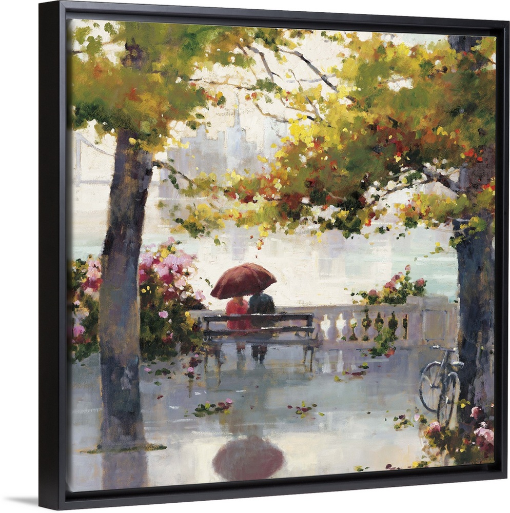 <p>Contemporary painting of a couple standing under a red umbrella and enjoying the scenery.</p>