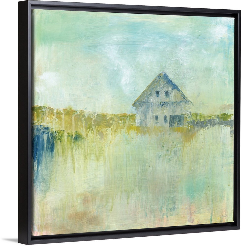 <p>Contemporary artwork of a a house across the fields featuring paint drips and vertical brush strokes.</p>