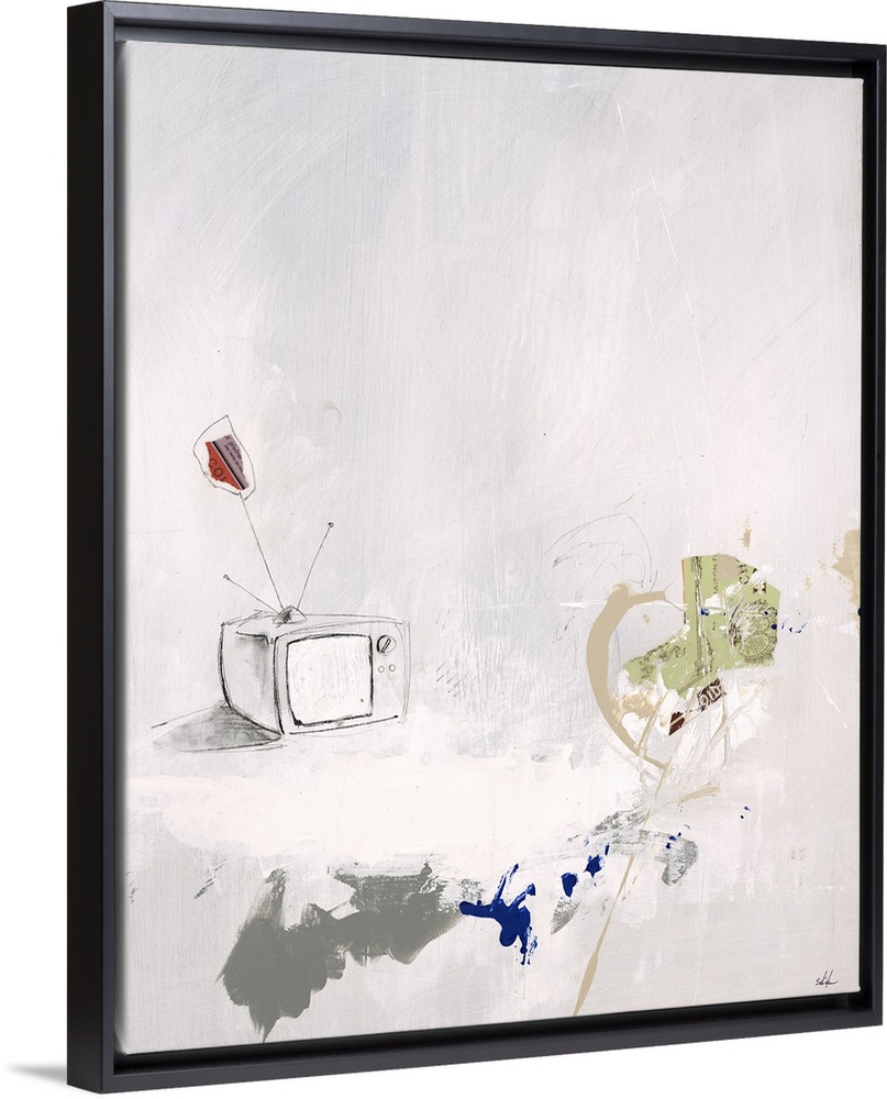 <p>Contemporary abstract painting of a pencil drawing of a TV set against a neutral toned background, with splashes of color.</p>