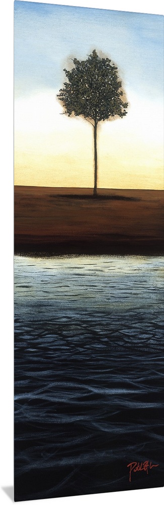 <p>A long vertical painting of a single tree next to a body of water with the sun setting behind it.</p>