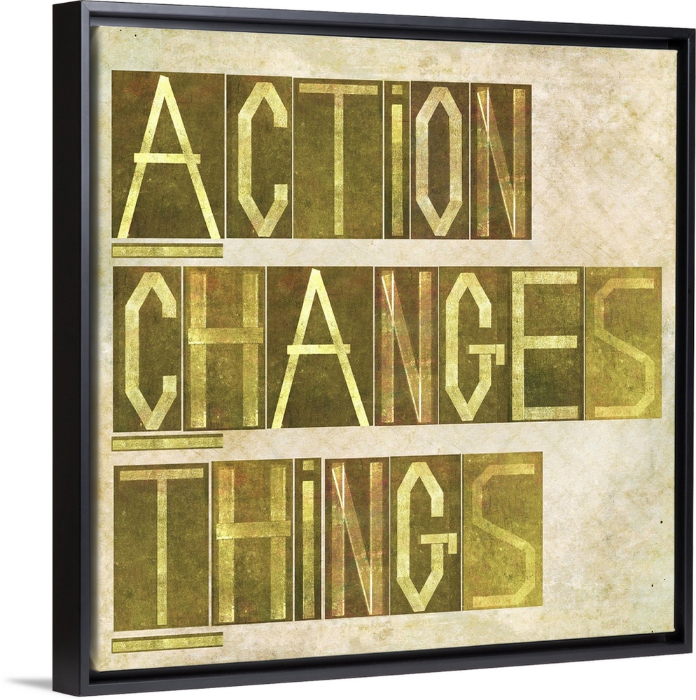 <p>Earthy background image and design element depicting the words "Action changes things"</p>