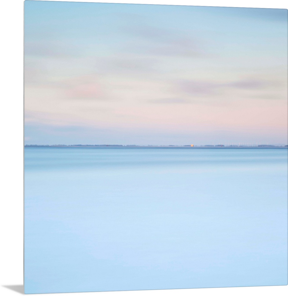 <p>A zen minimalist blue and pink dawn over water with just a distant horizon line and layers of pure colour.</p>