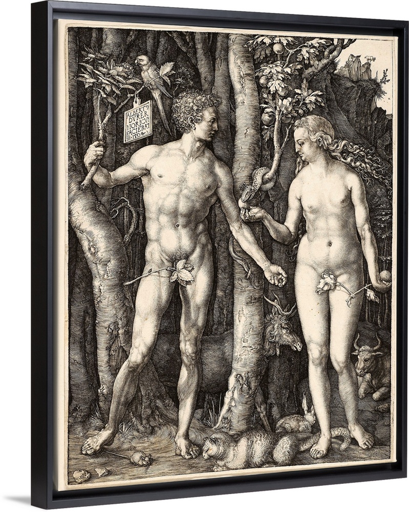 <p>Albrecht Dureros engraving, Adam and Eve, exhibits the extraordinary detail and tonal range of which he was capable. The print's meticulously described landscape and its symbolism are derived from late medieval art, while Durer's fascination with the canons of classical proportion and anatomy (Adam is posed like the Apollo Belvedere, while Eve recalls classical statues of Venus) comes from his study of Italian Renaissance art.</p>