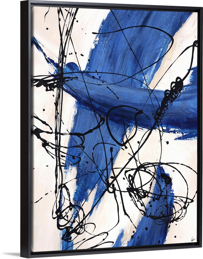 <p>Abstract painting, with bright blue paint swipes and dark black thin line splatters.</p>