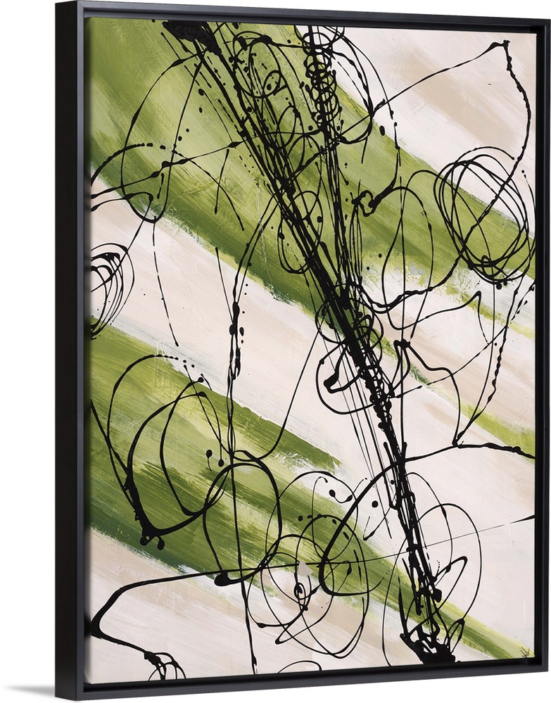 <p>Abstract painting, with bright green paint swipes and dark black thin line splatters.</p>