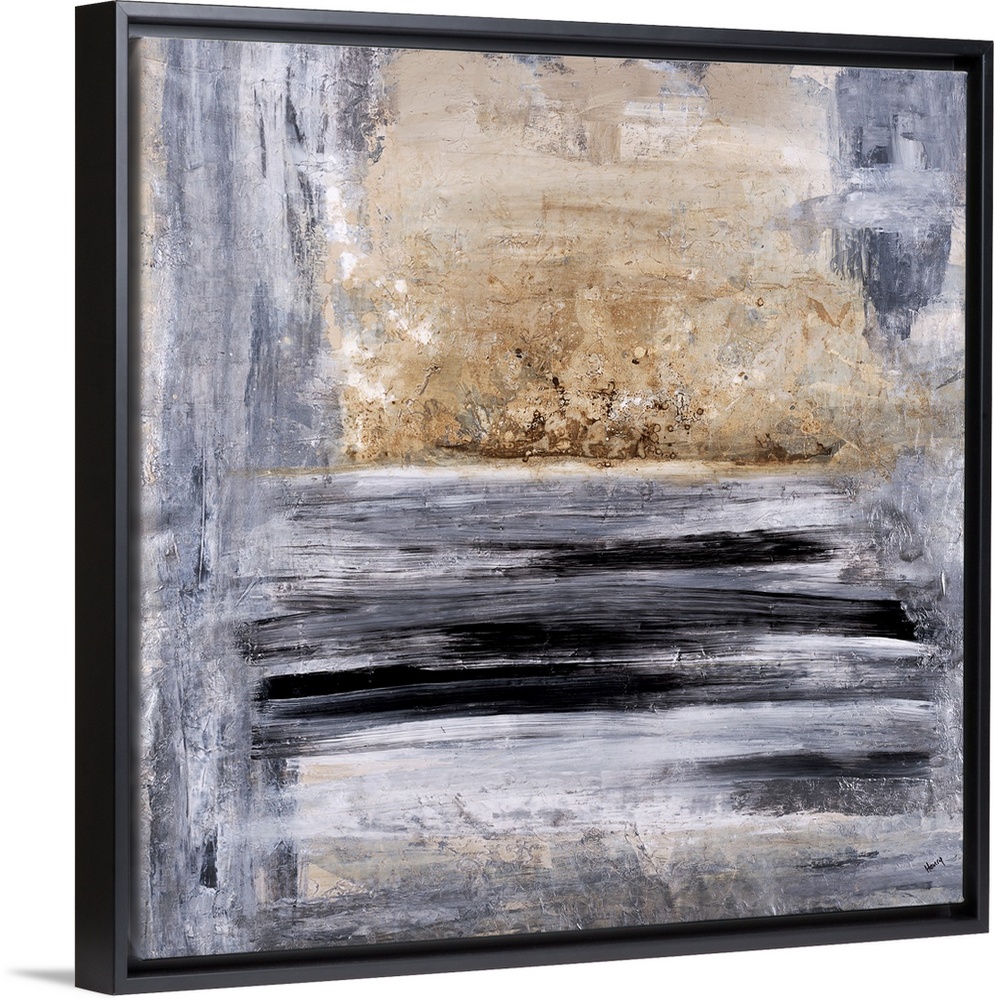 <p>Square abstract painting in black, gray, white, and gold hues.</p>