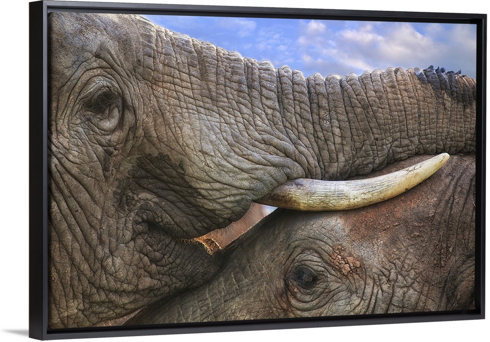 <p>Close-up photograph of two elephants in very close contact, resting their trunks and tusks on top of each other.</p>