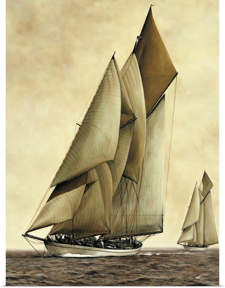 <p>Contemporary painting of two sailboats in the middle of the ocean with sepia tones.</p>