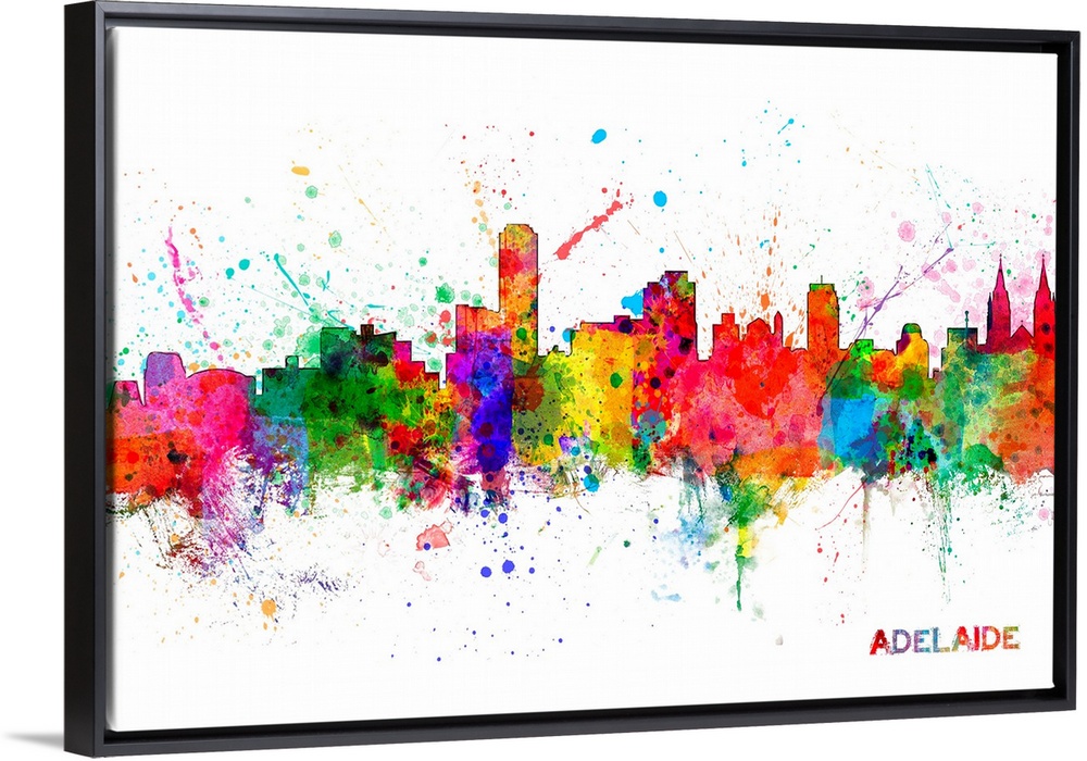 <p>Contemporary piece of artwork of the Adelaide, Australia skyline made of colorful paint splashes.</p>