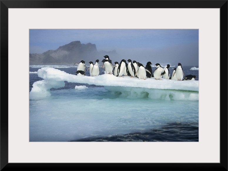 <p>ADELIE PENGUIN (Pygoscelis adeliae), GROUP CROWDING ON MELTING SUMMER ICE FLOE, POSSESSION ISLAND, ROSS SEA, ANTARCTICA</p>