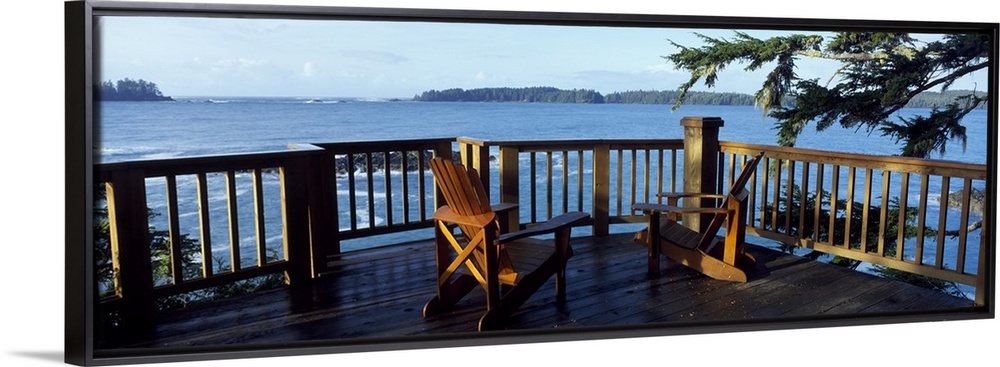<p>Two chairs sit on a raised deck overlooking a large body of water.</p>