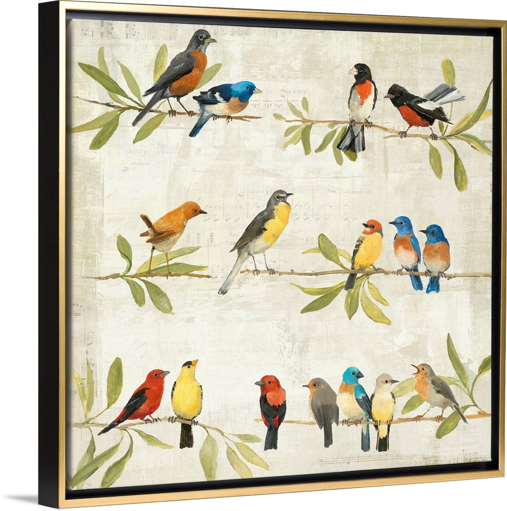 <p>Painting of three rows of branches filled with leaves and birds of different sizes and colors.</p>